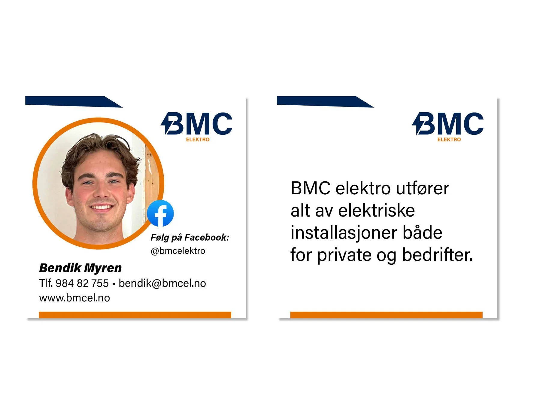 Bendik har startet eget elektroinstallasjonsfirma - BMC elektro. Her har Fraspark laget logo, fargepalett, nettside, grafikk, facebookside og facebookbanners/annonser.